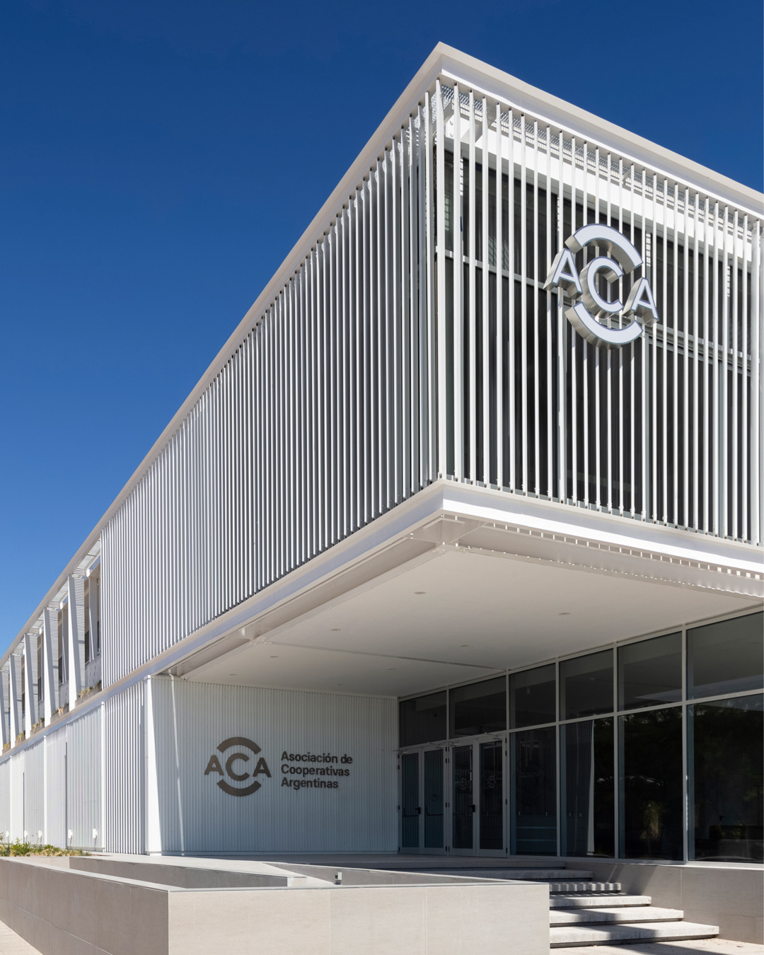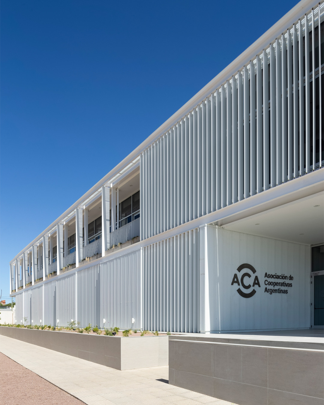 El estudio Arrillaga Parola Arquitectos diseñó un edificio de oficinas para la A.C.A. (Asociación de Cooperativas Argentinas) en el barrio Aldea Romana de Bahía Blanca, Argentina. Ubicada estratégicamente en una zona de desarrollo, la obra se concibe como un nuevo hito urbano que busca un diálogo de cercanía y transparencia con la comunidad. Su diseño recalca la innovación y la sostenibilidad, y se distingue porque los arquitectos utilizaron nuestros cortasoles lineales Fins para la gestión solar y la estética de las fachadas.