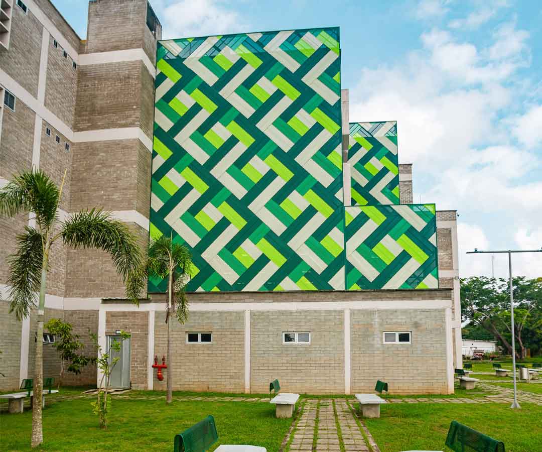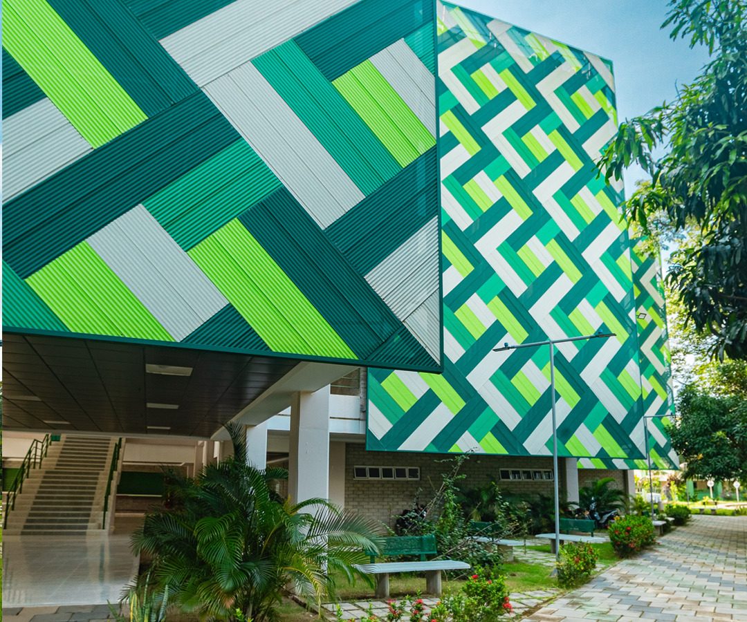 La fachada, protagonizada por nuestro revestimiento Miniwave, crea una piel metálica de líneas onduladas que no solo aporta una textura dinámica y moderna, sino que garantiza una alta resistencia y bajo mantenimiento ante el clima tropical, asegurando la estanqueidad y elevando la imagen del campus.