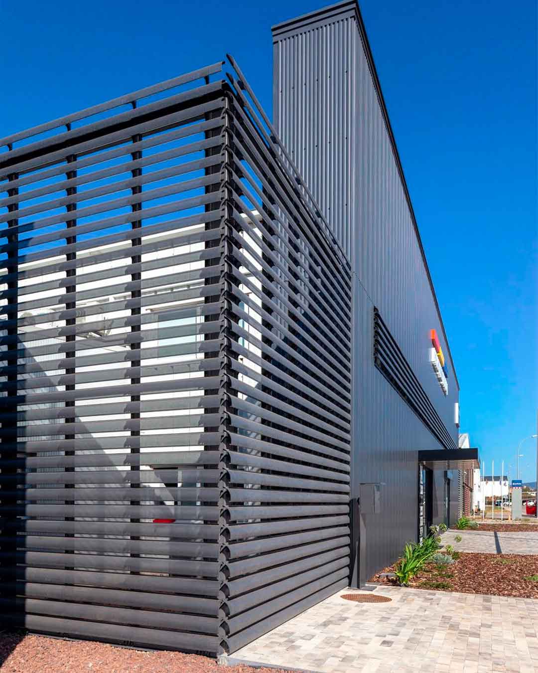 La rehabilitación de la fachada del Hangar de Heliswiss Ibérica en el Aeropuerto de Sabadell (Barcelona) es un caso de estudio sobre cómo la arquitectura puede redefinir la imagen de un espacio industrial sin comprometer su función. Hemos sido los aliados perfectos para esta renovación audaz, combinando la precisión de Quadrolines 30×15 con la eficiencia del control solar de las Celosías Celoscreen.