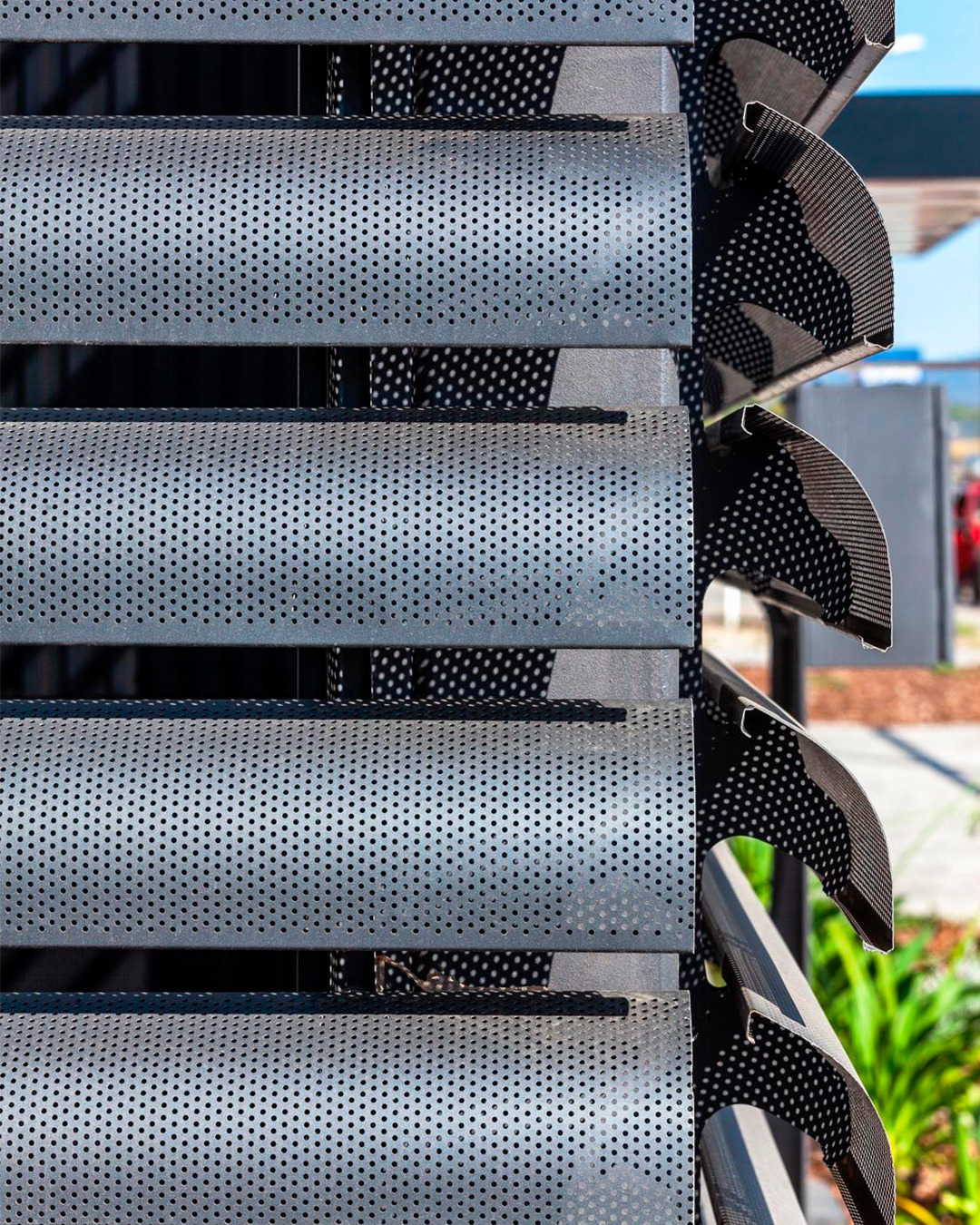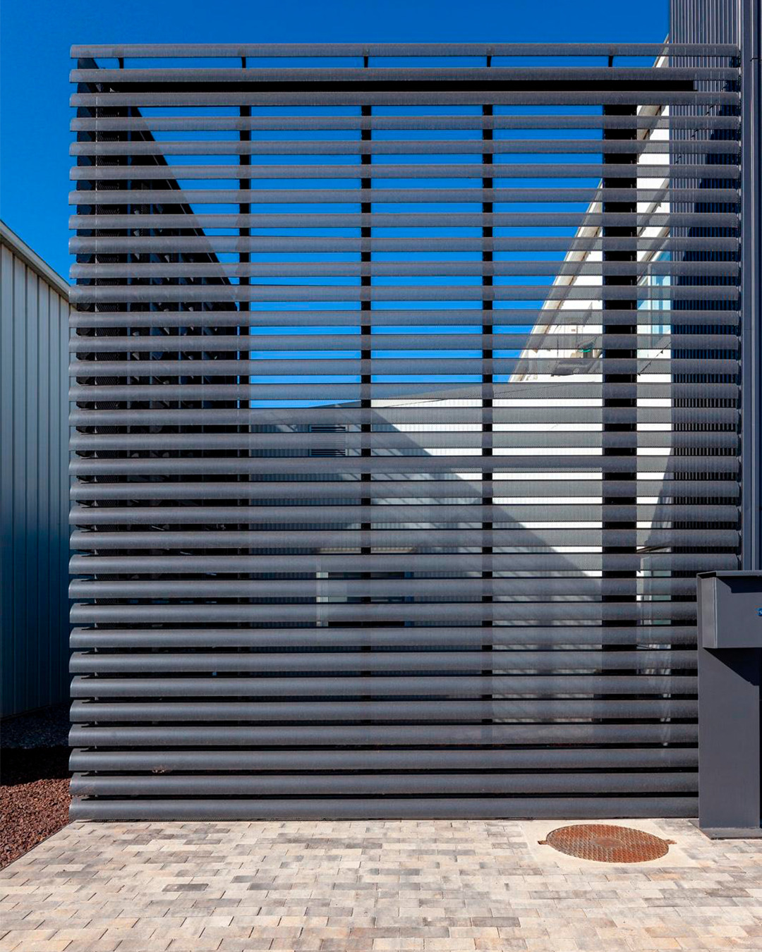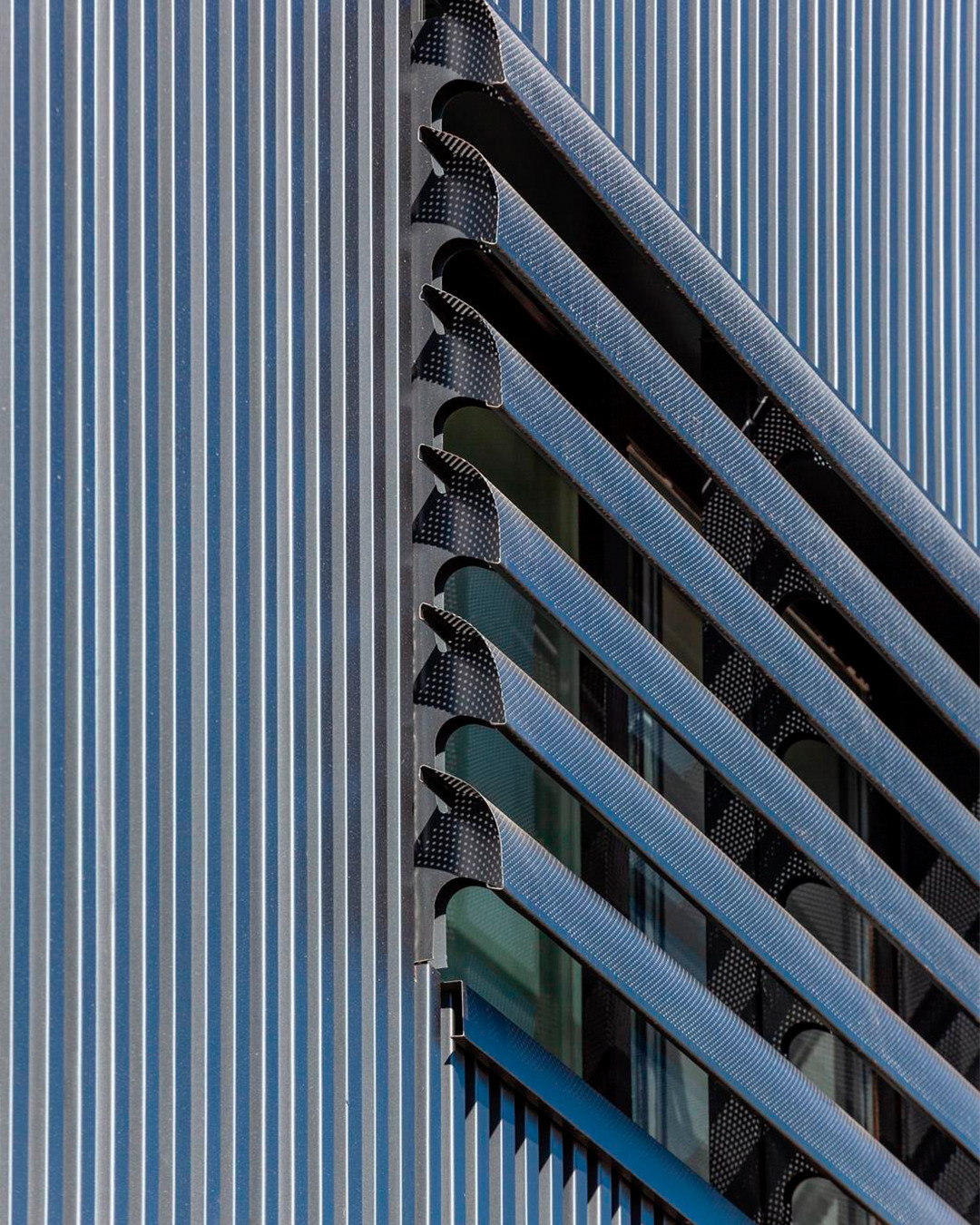 El sistema Quadrolines 30×15 se utiliza para crear un revestimiento vertical moderno y con ritmo, aportando una sensación de escala y altura que moderniza instantáneamente la estructura. Su robustez y durabilidad son esenciales en un entorno expuesto como un aeropuerto.